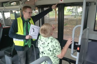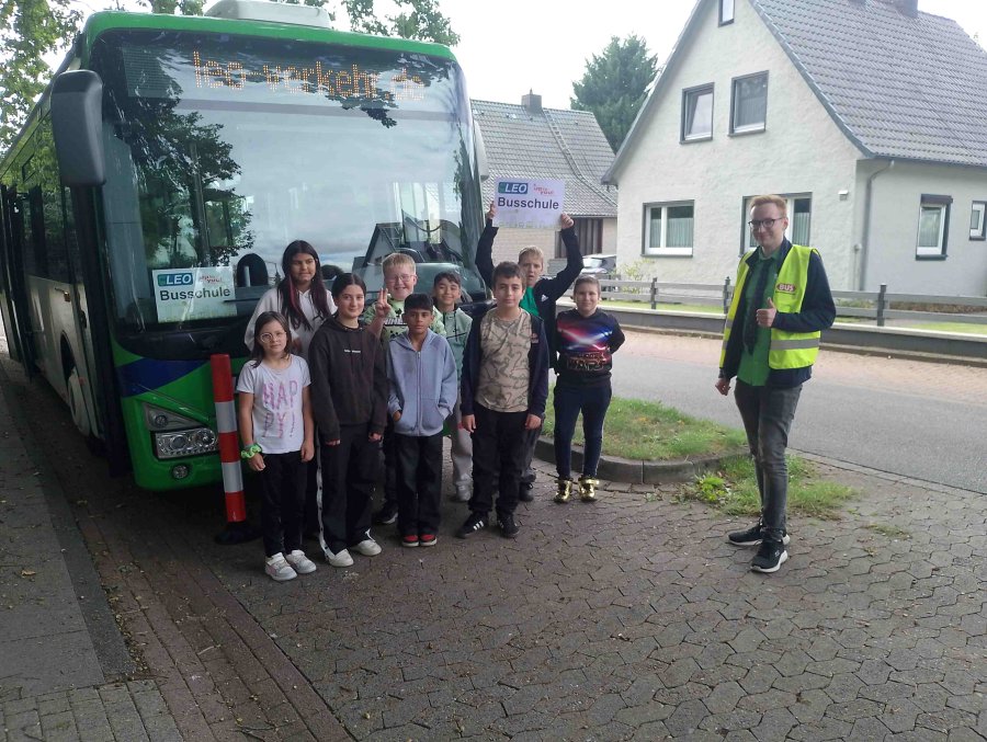 Conner Lemmermann von der LEO Verkehrs-GmbH zeigte uns verschiedene wichtige Punkte, die beim Busfahren zu beachten sind. Dazu gehörten unter anderem: