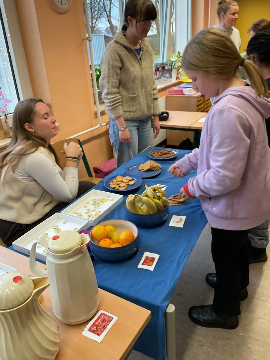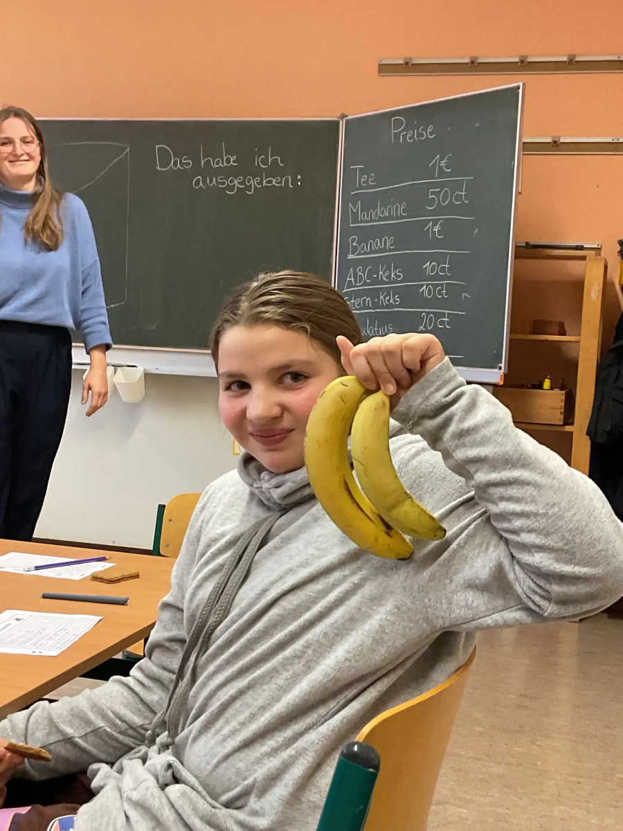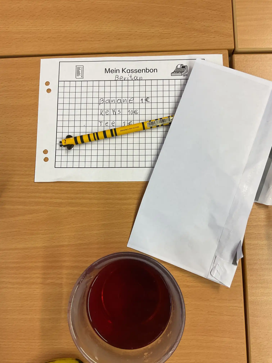 So konnten am Donnerstag alle zusammen mit „echtem Geld“ einkaufen gehen und am Freitag fand in der Klasse ein kleiner Weihnachtsmarkt statt, bei dem Tee, Obst und Kekse (mit Spielgeld) gekauft und auch verzehrt werden konnten. Natürlich mussten dabei auch am Freitag die Ausgaben notiert und berechnet werden!